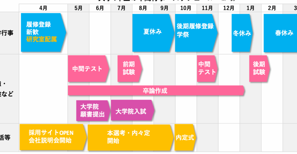 毎日のルーチンは、授業や研究、就職活動を中心に構成されます。具体的には以下のような活動が含まれます。