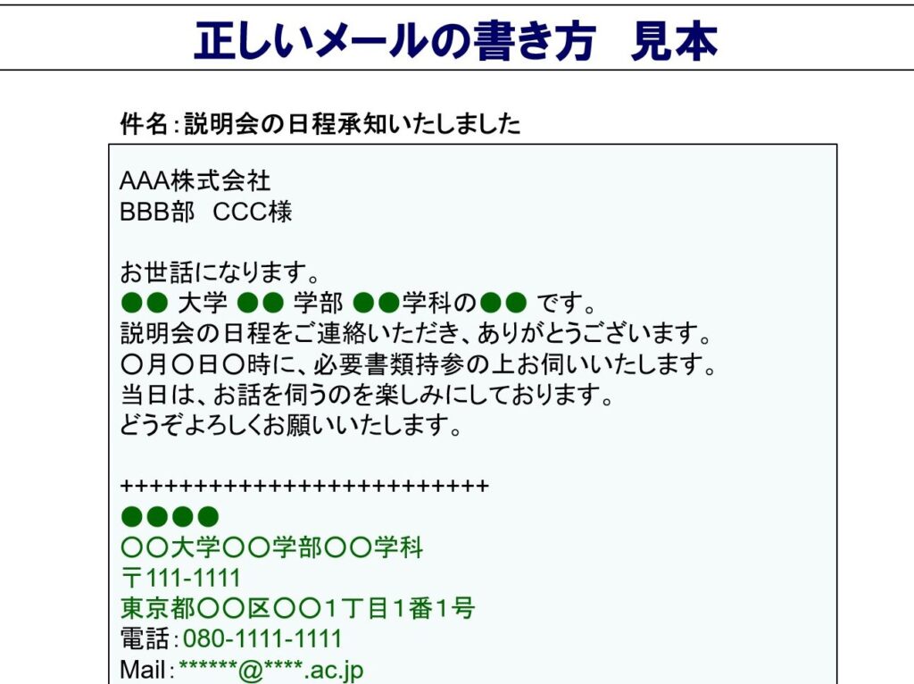 - 署名: 自分の名前、学部、学年、連絡先