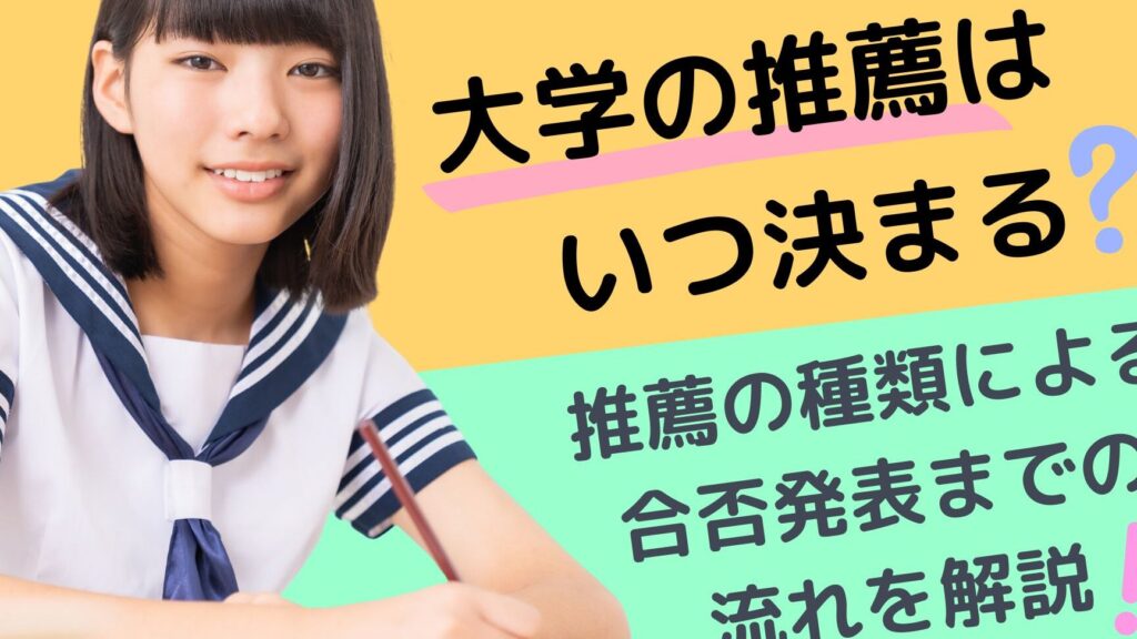 大学推薦の決定時期は、各大学によって異なることが多いです。一般的に、推薦の発表は入試前の数ヶ月内に行われますが、具体的なスケジュールについては各校の方針に依存します。