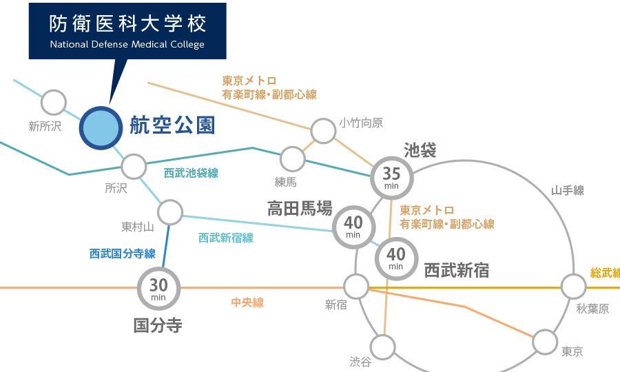 キャンパスは、最寄り駅から徒歩圏内にあります。主な公共交通機関として、以下のものがあります。