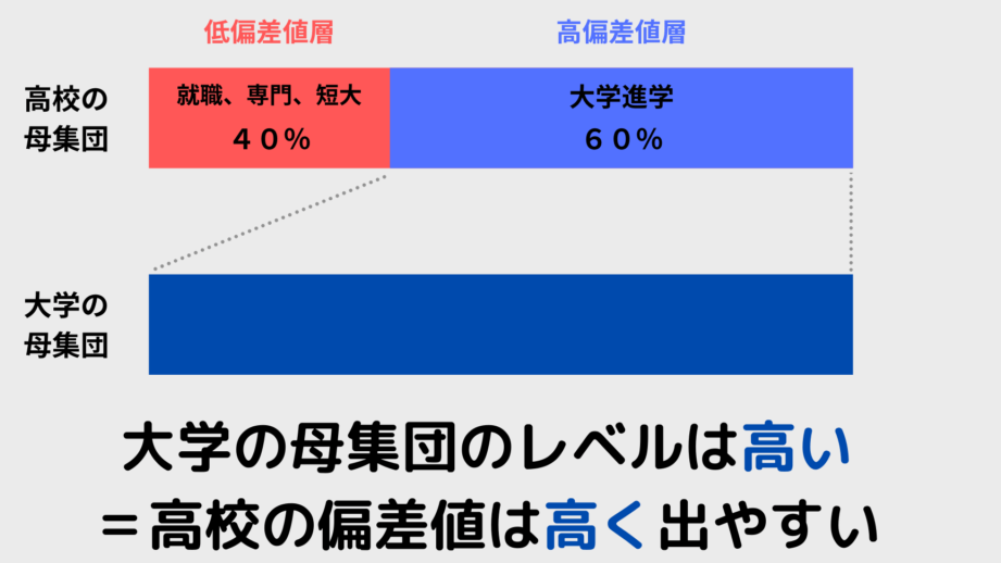 国内の大学は、偏差値によっていくつかの層に分類されます。例えば、以下のように偏差値の幅が広がっています。