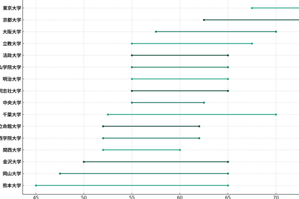 以下は各マーチに属する大学の一般的な入試偏差値を示した表です。この数値は受験生にとって非常に重要であり、それぞれの大学への合格可能性を考える際に大きな指標となります。