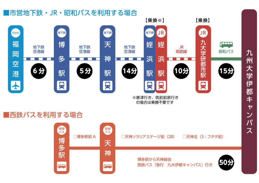 - 地下鉄とバス: 地下鉄空港線「天神駅」から西鉄バスに乗り換え、「伊都キャンパス入口」停留所下車。そこから徒歩約15分。