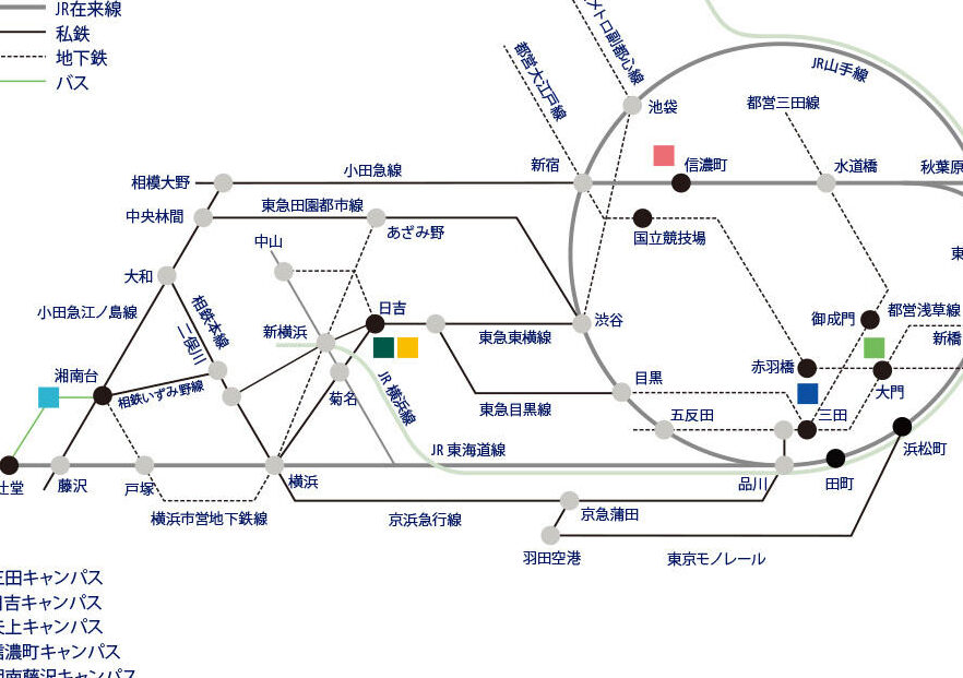 三田キャンパスには多くの路線が走っており、都心からのアクセスも良好です。主な交通手段は以下の通りです。