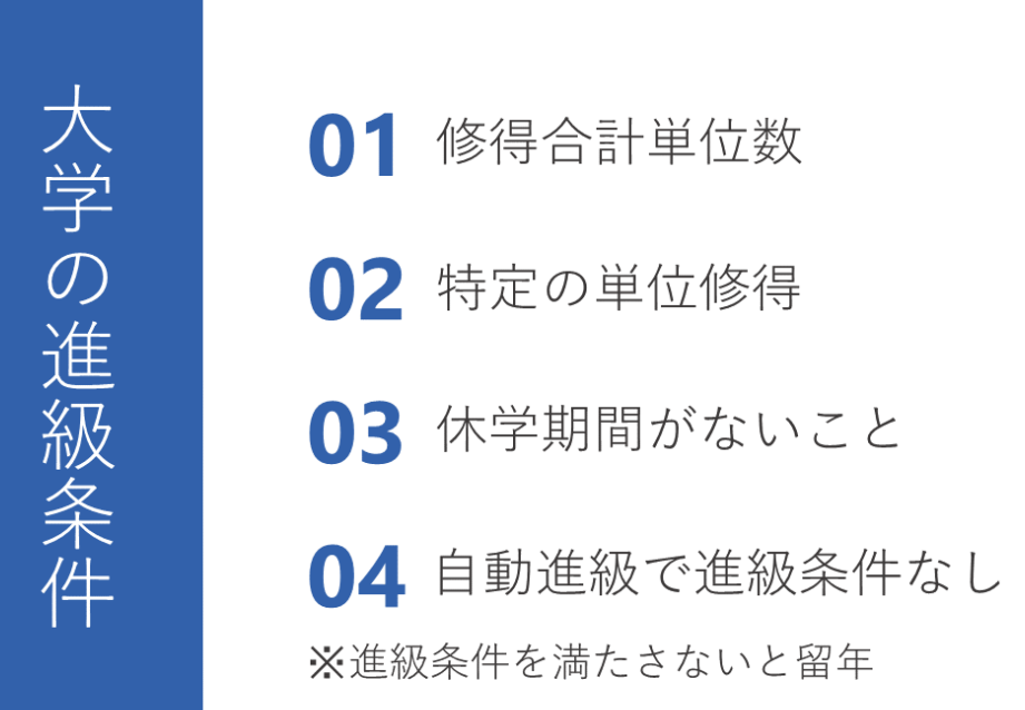 各大学には独自の進級基準が設定されており、この基準を満たさない場合は進級できない可能性があります。一般的には以下のような要素が考慮されます: