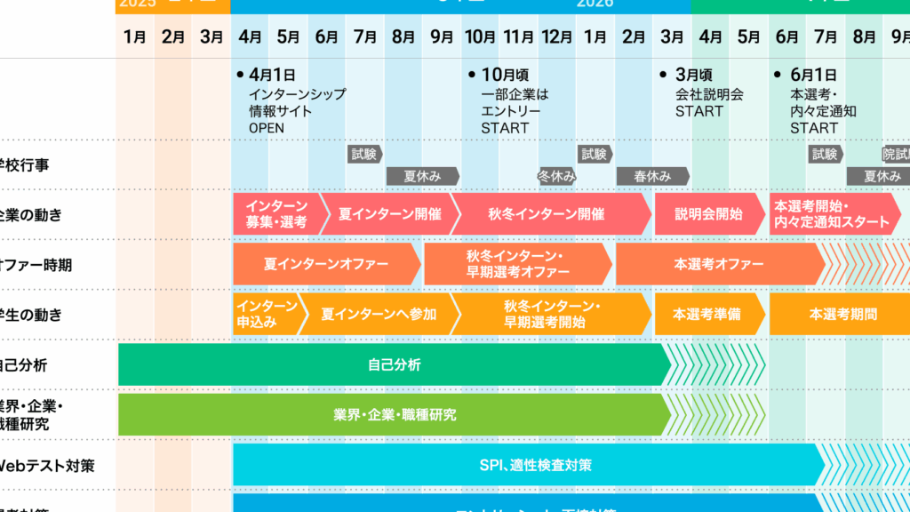 - 情報収集(3年次春): 業界研究や企業分析を行う時期です。