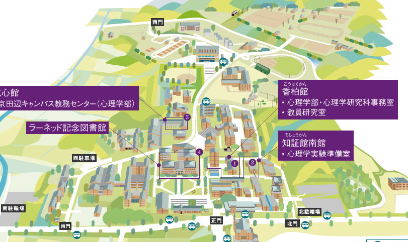 - 京田辺キャンパス: 本校舎や多くの学部が集結している中心的なキャンパス。