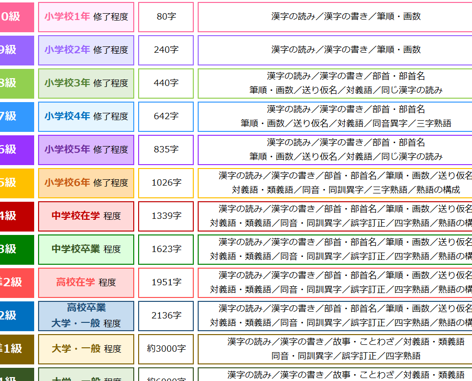 準2級になると600文字程度の漢字知識が要求され、この段階では基礎力を強化し、自信を持つことが期待されます。また、3級以下は初歩的な知識獲得となり、基本的な読み書き能力を育成することに重点が置かれています。