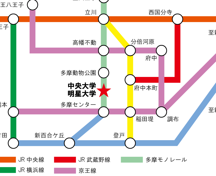 京王八王子駅からはバスの利用が便利です。中央大学行きのバスは頻繁に運行されており、所要時間は約10分程度です。バス停から降りるとすぐ近くに白門がありますので、とても簡単です。また、このルートでは周囲の風景も楽しむことができるため、おすすめです。