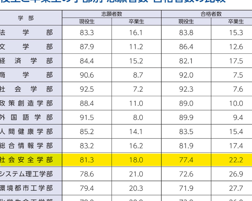 この表からわかるように、法学部や商学部は特に倍率が高く設定されています。そのため、これらの分野を志望する場合には、高い得点が求められることが理解できます。また、経済学部も一定以上の成績を維持しなければならないため、それぞれ押さえておくべきポイントがあります。