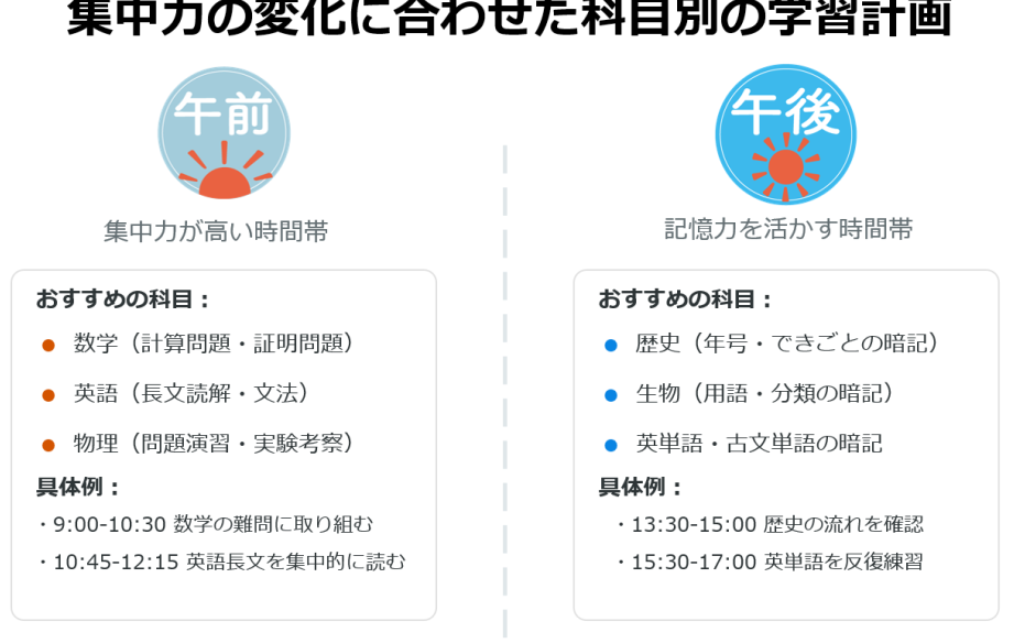 - 科目別の優先順位: 自分が得意な科目と苦手な科目を把握し、苦手科目には特に多くの時間を割くようにしましょう。