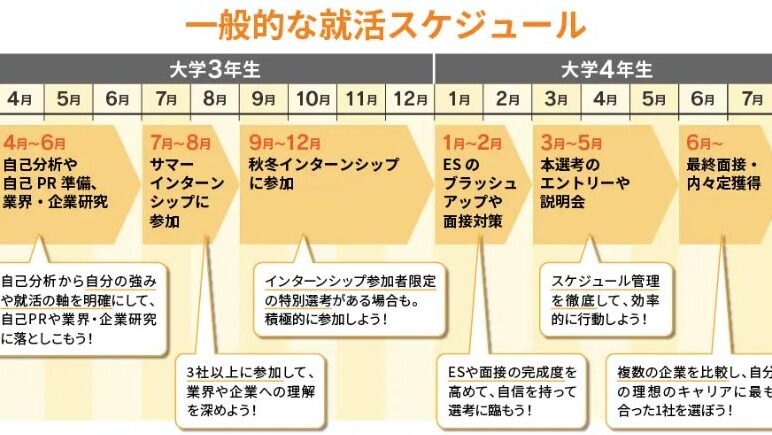 | 就職活動開始時期 | 一般的には大学3年生あたりから準備し始めます。最終的には4年生になる頃には決定したいところです。 |