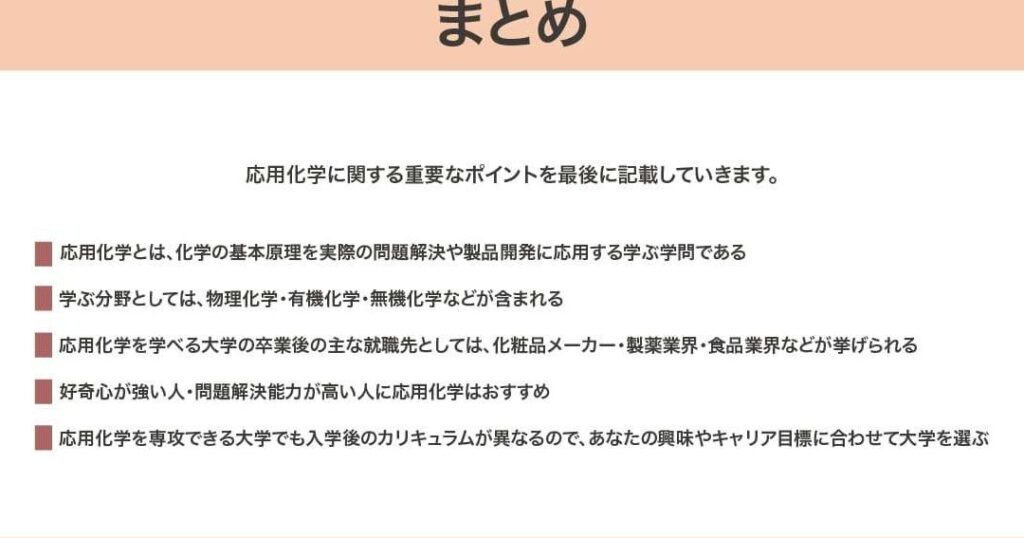 - 応用化学:材料科学、生物医学など。