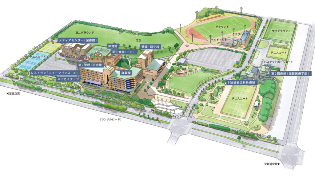 私たちのキャンパス周辺には、学習や生活を支えるための多くの施設があります。明海大学は、学生が快適に過ごせる環境を提供するために重要な位置にあります。近隣にはさまざまな飲食店やショッピングエリア、公園などがあり、日常生活においても充実した時間を過ごすことができます。