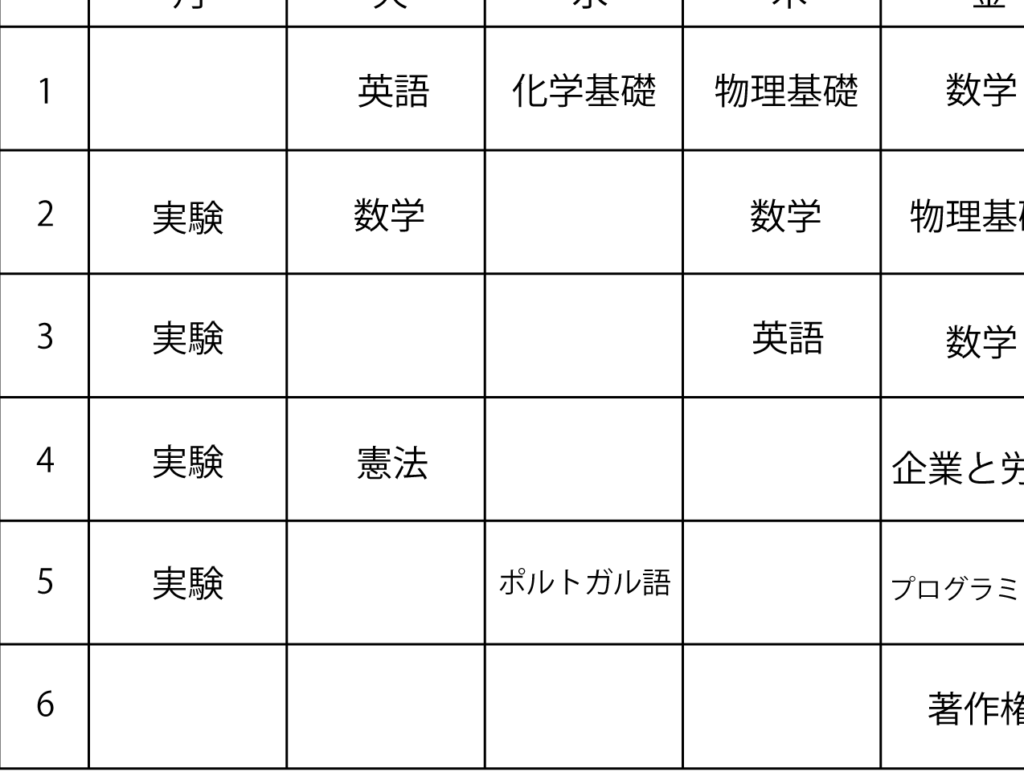 この表からわかるように、多くの学生は月曜から金曜までの間で授業を受けています。ただし、水曜日は休講になる場合も多く、この点も考慮してスケジュールを立てる必要があります。また、特定の専門科目や選択科目によっては、土曜日にも授業がある場合があります。