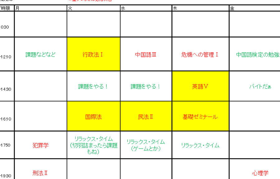 以下は一般的な大学二限目の時間割例です。この表を参考に、自分自身の通う大学と比較してみてください。