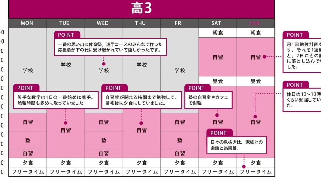 - 時間配分: 各科目への勉強時間を均等に配分しつつ、自身の苦手科目には特別な時間を設けます。