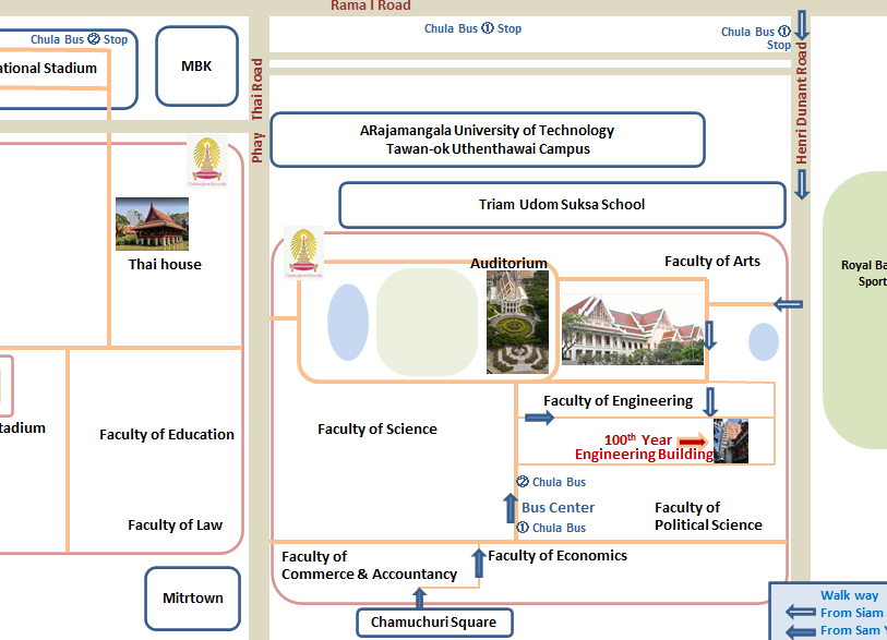 - BTS サイアム駅: 大学まで徒歩約15分で到着します。サイアム地区はバンコクの中心地でもあるため、多くのショッピングセンターや飲食店にも近接しています。