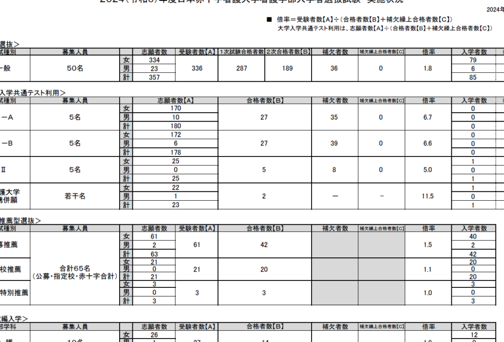このように、日本赤十字看護大学では約40%から45%程度の合格率を維持しており、他校と比較しても安定した数字と言えるでしょう。また、この結果にはいくつかの要因が影響しています。例えば、入試内容や募集人数、受験生のレベルなどがあります。