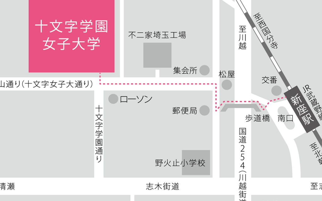 以下の地図は、十文字学園女子大学への主要なルートを示しています。注意深く確認しながら移動するとより安心です。