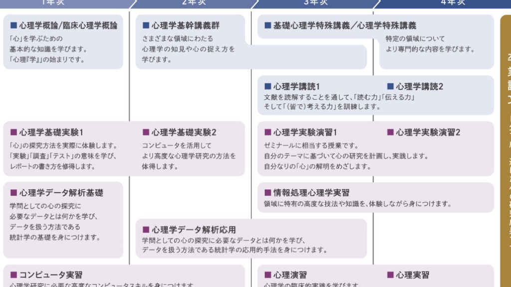 心理学専攻では、以下のような主要な必修科目が設定されています。これらの科目はすべて学生が深く理解し、様々な場面で応用できるよう設計されています。