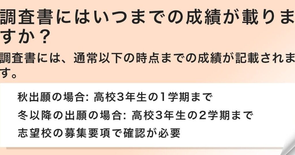 - 最終学年(高3)の第一学期まで:一部の大学では、高3年生になる直前までの成績を評価対象とすることもあります。