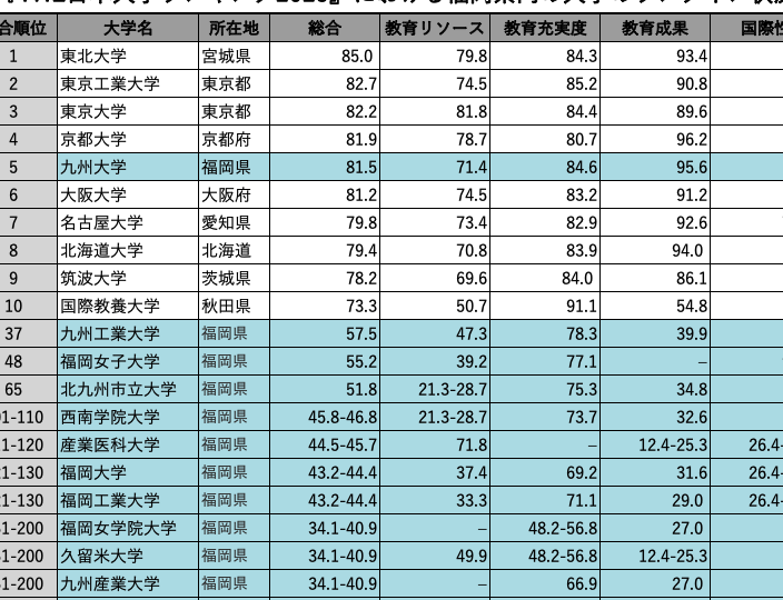 また、福岡女学院大学では特に教育学部が優れた成績を収めており、その全国的な評価も上昇しています。例えば、最新の調査によると、同学部は昨年度よりもさらにランクアップし、第10 位 という結果となりました。このような成果は、生徒への手厚い指導やカリキュラム改善によるものと考えられます。