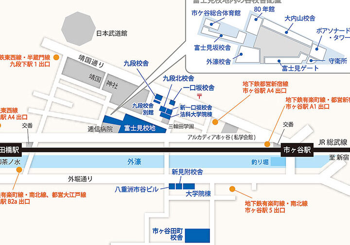 市ヶ谷キャンパスは、千代田区にある法政大学の中心的な拠点です。この場所は利便性が高く、多くの交通機関からアクセスしやすいです。周囲には公園や文化施設も多いため、勉強だけでなくリラックスする場としても最適です。