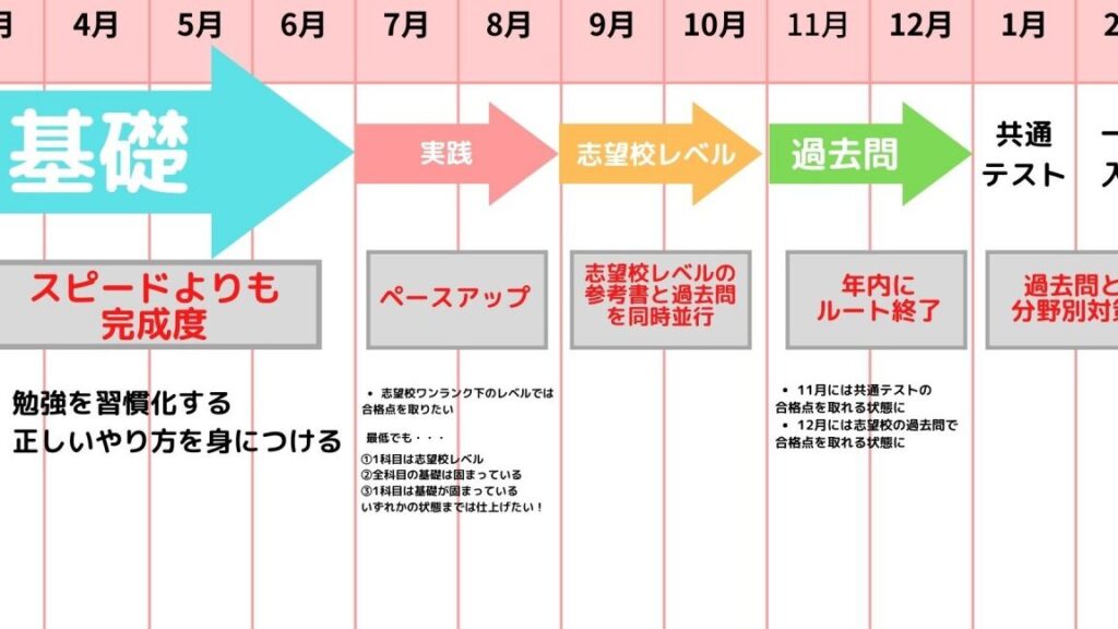 | 高校3年生前半 | 過去問演習開始(模試参加) | 実践力強化 |