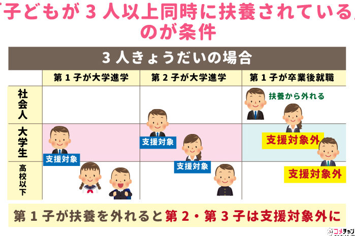 - 3人以上の子ども:一般的には、この数から大学無償化制度が適用され始めます。