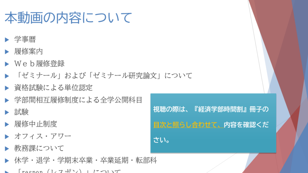 - 学期開始前に必ず自分の希望する授業を確認し、所定の方法で申請します。