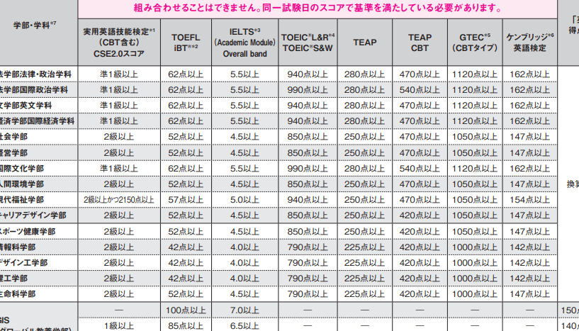 | 大学名 | 必要な英検レベル | 要求されるスコア |