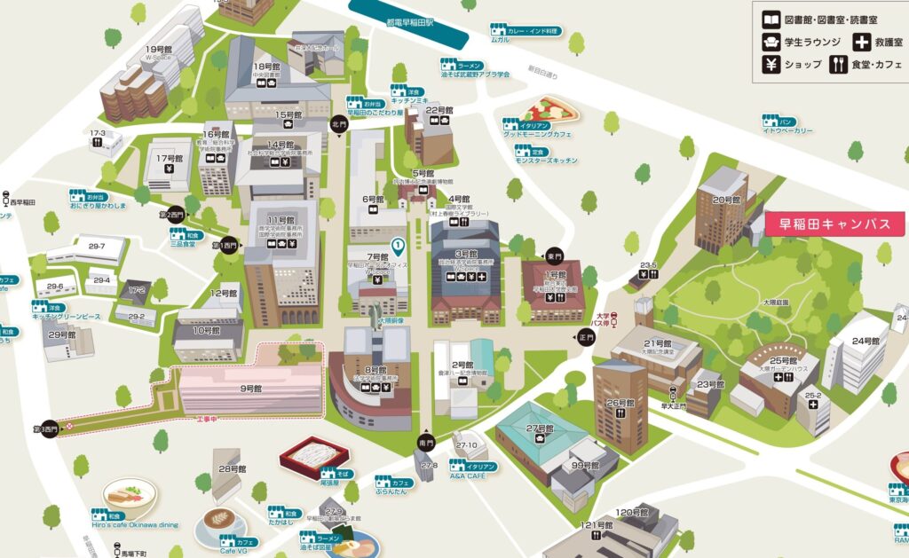 以下は、早稲田大学奨学課何号館近くにある主な施設です: