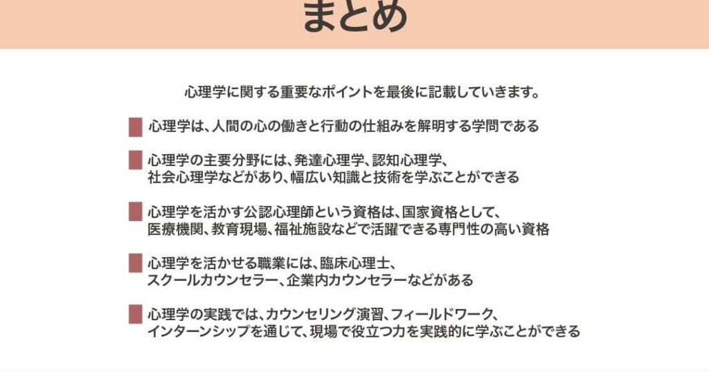 - 教育への応用: 教育心理学では、生徒一人ひとりのニーズやスタイルに合わせた教授法が求められるため、この分野で得た知識は教育現場でも活用されます。